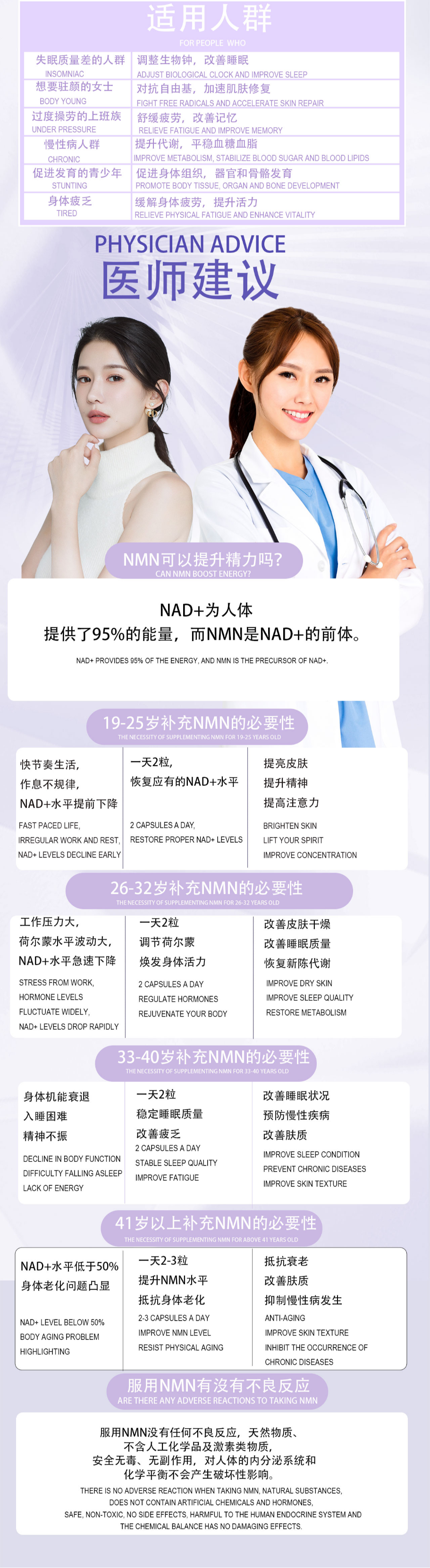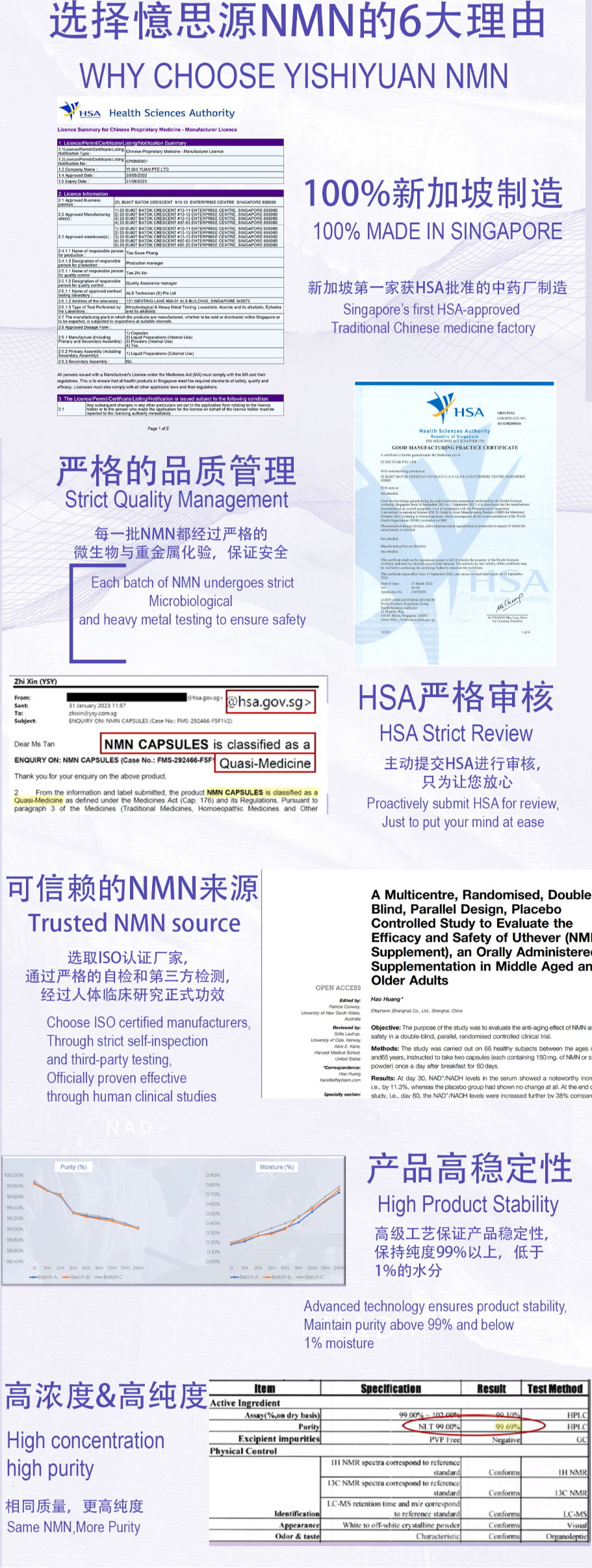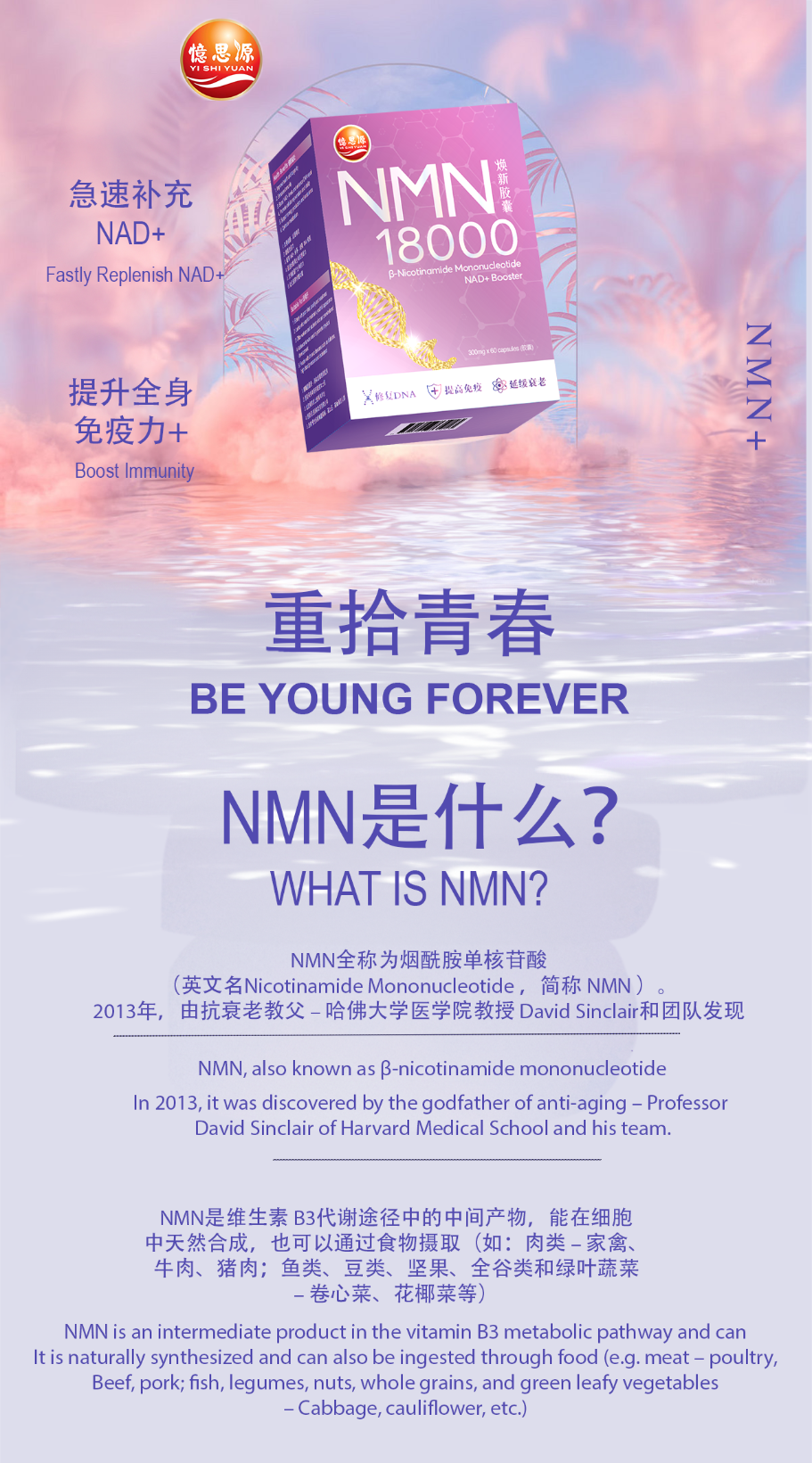 Yi Shi Yuan NMN Capsules is made with pure NMN under strict GMP standards. It supports the optimum levels of NAD+ in the body, thereby reduce tiredbess caused by aging. Yi Shi Yuan NMN is the one to let you be embraced with full of youthful energy and wellness from the inside out.